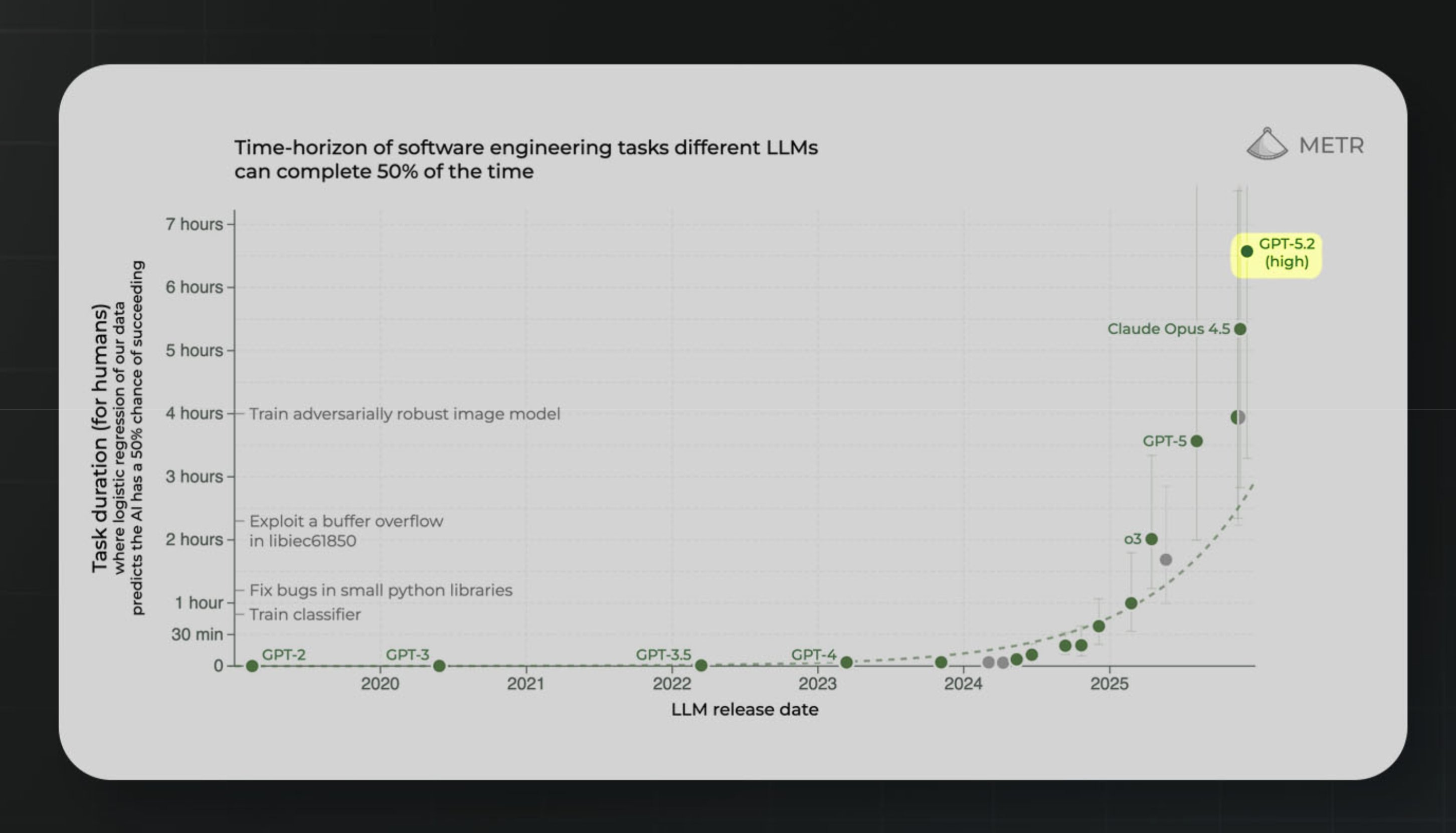 La organización METR, que desarrolla evaluaciones independientes de IA, aporta la medición que sustenta el optimismo. Su investigación muestra que la duración de las tareas que los agentes completan de forma autónoma se duplica cada siete meses. GPT-5.2 ya muestra un horizonte temporal de unas 6,6 horas en tareas de software. Si la tendencia se mantiene, pronto hablaremos de agentes que completan proyectos de semanas.