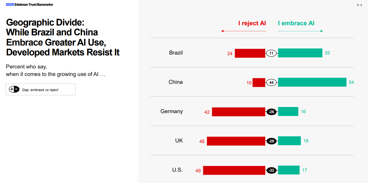 Y luego tenemos una gran división geográfica y cultural. Asia y países emergentes (China, India, Sudeste Asiático, países del Golfo, Nigeria) son mucho más positivos respecto a la IA y empresas tecnológicas. En ellos el optimismo y la emoción superan el 70-80%, ven la IA como una herramienta educativa y de ascenso social (Ipsos, Stanford).