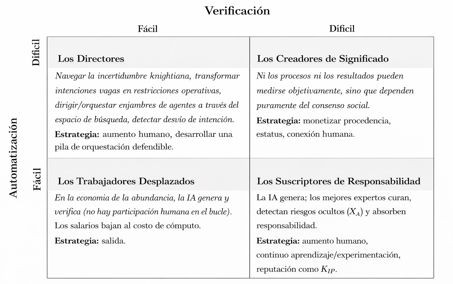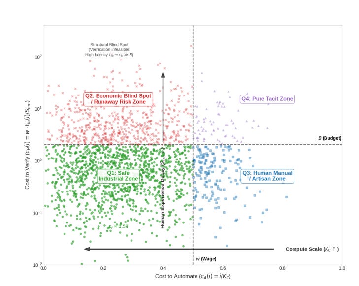El paper establece una tipología de cuatro zonas económicas que particiona toda la actividad productiva: la Zona Industrial Segura (barata de automatizar y verificable), la Zona de Riesgo Descontrolado (barata de automatizar pero inverificable), la Zona Artesanal Humana (difícil de automatizar pero verificable) y la Zona Puramente Tácita (ni automatizable ni verificable).