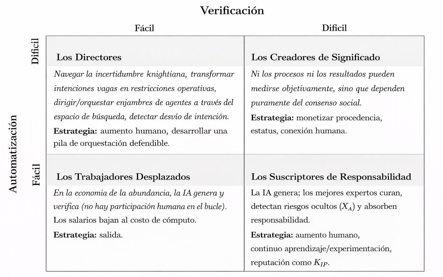 Creo que la cuestión más interesante a discutir es qué pasa cuando automatizar una tarea es barato pero comprobar que el resultado es correcto sale caro, pero creo que merece la pena detenernos un poco en los cuadrantes que plantean los autores.