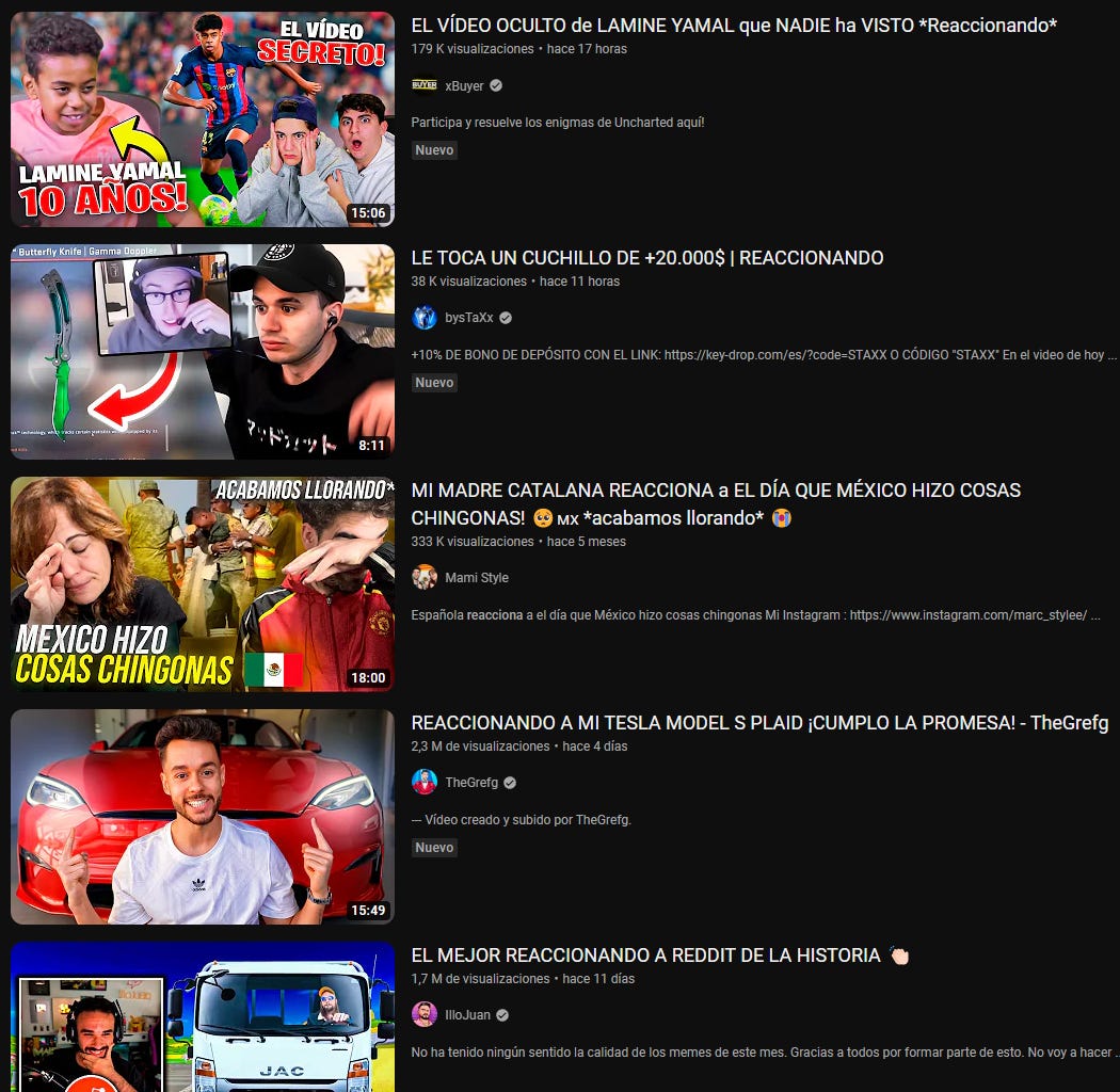 Su común denominador es la del mimetismo: las carátulas, la temática, el modelo. Copiar y adaptar formatos de otros youtubers, pero también del pasado (desde concursos a veladas de boxeo) apalancados en su popularidad. Que géneros como el “reaccionando” sean de los más populares (es de los de mayor rentabilidad en horas de emisión frente a esfuerzo de producción) refleja que si un creador ha sido influyente en esta generación ese ha sido Cabronazi.
