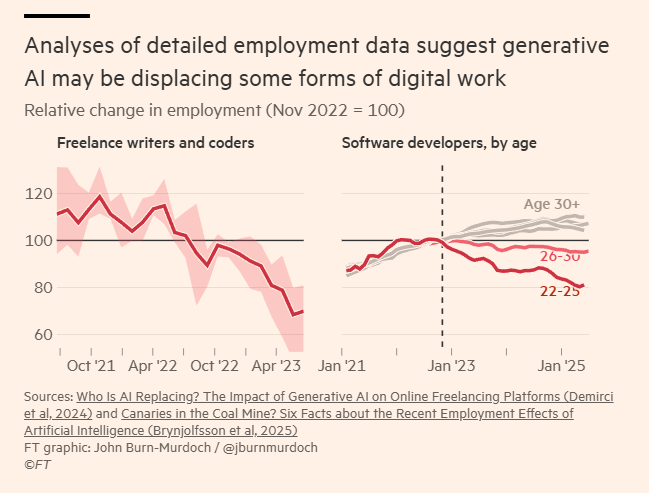 Me ha interesado mucho la pieza de John Burn-Murdoch y Sarah O’Connor en FT en la que, ante todo, reconocen que el impacto macroeconómico de la inteligencia artificial en la destrucción de empleo aún no es claro: los datos de encuestas laborales en EE.UU., Reino Unido y Europa occidental no muestran una correlación evidente entre la adopción de IA y el desempleo generalizado.